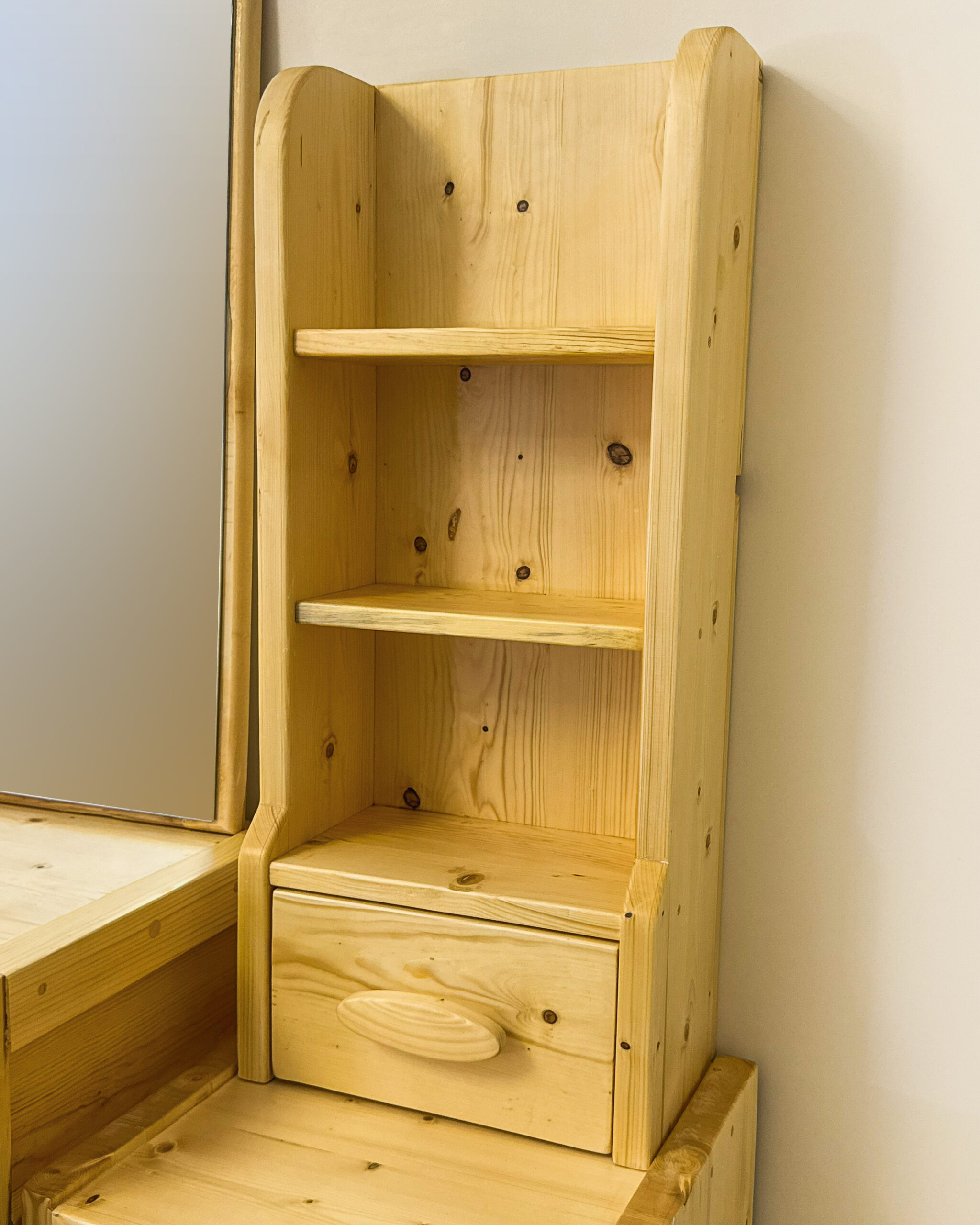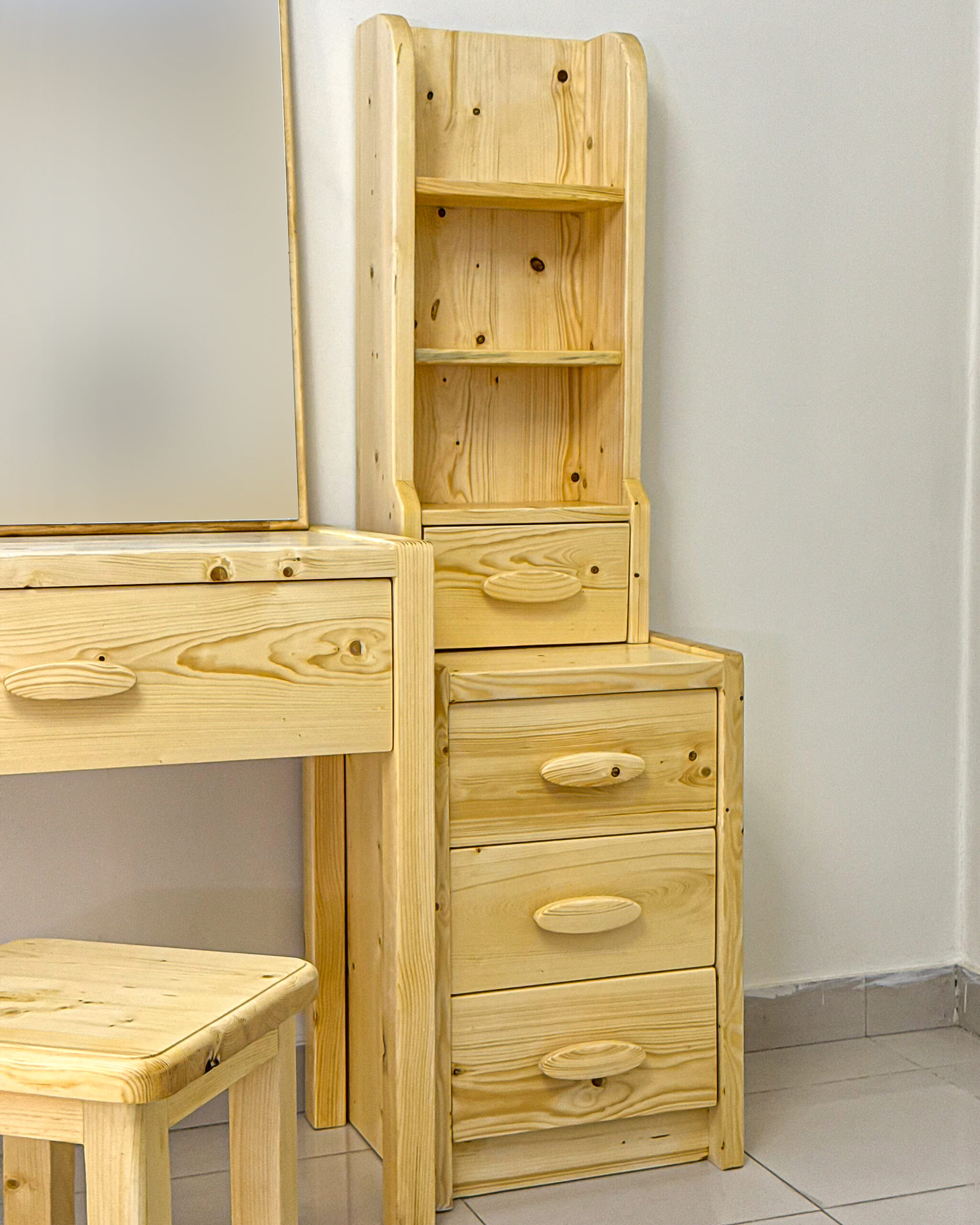 این ست شامل میز، صندلی، آینه و یک شلف کنارمیزی با کشوهای جادار است که فضای کافی برای لوازم آرایشی، اکسسوری و وسایل روزمره فراهم میکند.